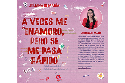 Juliana Di María encontró en la escritura un refugio desde muy joven, pero no fue hasta 2024 cuando decidió compartir su voz con el mundo a través de El reloj del juicio final, Matusalén I, su primera obra publicada. Desde entonces ha cultivado una narrativa que refleja experiencias diversas y una sensibilidad profundamente humana, influenciada por su vida entre Colombia y Brasil. Con su nuevo libro, A veces me enamoro, pero se me pasa rápido, explora con honestidad el amor y el desamor juvenil, invitando a las lectoras a reconocerse en una voz confesional y cercana que la perfila como una de las autoras revelación de la literatura contemporánea.