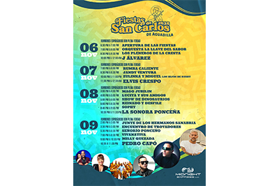 Itinerario oficial de las Fiestas de San Carlos 2025 jueves 6 de noviembre Rumbones con Plena Verdad 6:30 pm a 7:00 pm Apertura de las Fiestas 7:00 pm a 8:00 pm Orquesta La Llave del Sabor 8:30 pm a 9:30 pm Los Pleneros de la Cresta 10:00 pm a 12:00 am J Álvarez viernes 7 de noviembre Rumbones con Plena Verdad 7:00 pm a 8:00 pm Rumba Caliente 8:30 pm a 9:30 pm Jandy Ventura 10:00 pm a 11:00 pm Zulinka y Miguel Los Hijos de Rubby 11:30 pm a 12:30 am Elvis Crespo sábado 8 de noviembre Rumbones con Plena Verdad 3:00 pm a 4:00 pm Mago Jublín 4:00 pm a 5:00 pm Lucita y sus Amigos 5:00 pm a 6:00 pm Show de Dinosaurios 6:00 pm a 8:30 pm Reinado y Desfile 8:40 pm a 9:55 pm Sophy 10:30 pm a 11:30 pm La Sonora Ponceña domingo 9 de noviembre Rumbones con Plena Verdad 2:00 pm a 3:00 pm Junte de los Hermanos Sanabria 3:30 pm a 5:00 pm Encuentro de Trovadores 5:30 pm a 6:30 pm Señorío Ponceño 7:00 pm a 8:30 pm Vivanativa 9:00 pm a 10:00 pm Milly Quezada 10:30 pm a 11:30 pm Pedro Capó |