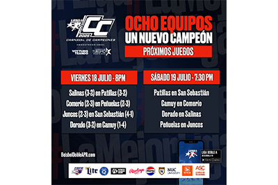 Este fin de semana se llevarán a cabo los últimos juegos del ‘round robin’. Este viernes a las 8:00 p.m., Salinas (3-2) jugará en Patillas (3-2),  Comerío (2-3) en Peñuelas (2-3), Juncos (2-3) en San Sebastián (4-1) y Dorado (3-2) en Camuy (1-4). Este sábado, los juegos comenzarán a las 7:30 p.m., con Patillas en San Sebastián, Camuy en Comerío, Dorado en Salinas y Peñuelas en Juncos. De ser necesarios, este domingo serán los juegos de la ronda de desempate.