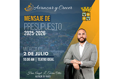Yauco, Puerto Rico – El alcalde del Municipio Autónomo de Yauco, Ángel “Luigi” Torres Ortiz, ofrecerá este miércoles, 2 de julio de 2025, su Mensaje de Presupuesto para el año fiscal 2025-2026, en un acto oficial a celebrarse a las 10:00 a.m. en el emblemático Teatro Ideal.