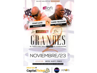 Este próximo 23 de noviembre el Hotel Aloft de Ponce se convierte en un campo de batalla musical, ante el junte entre el merenguero Juan Luis “Juancho” y el salsero Luigi Texidor, mejor conocido como el negrito del sabor”. “La Batalla de dos [.mas.]