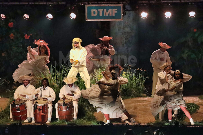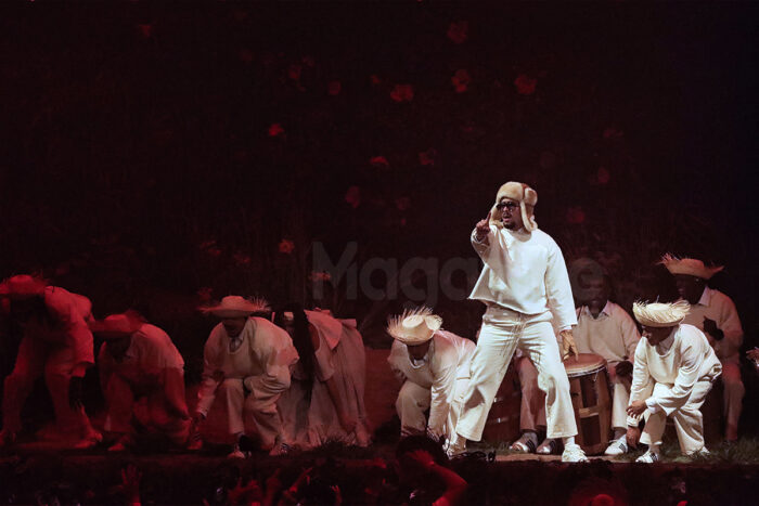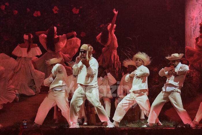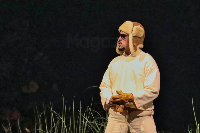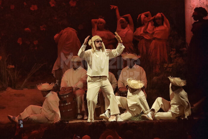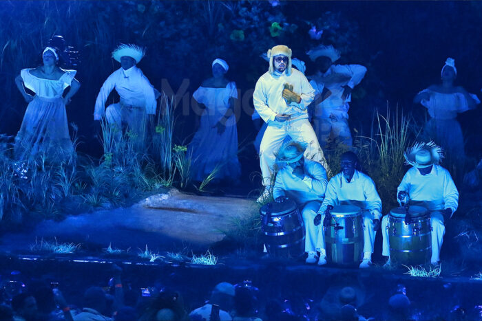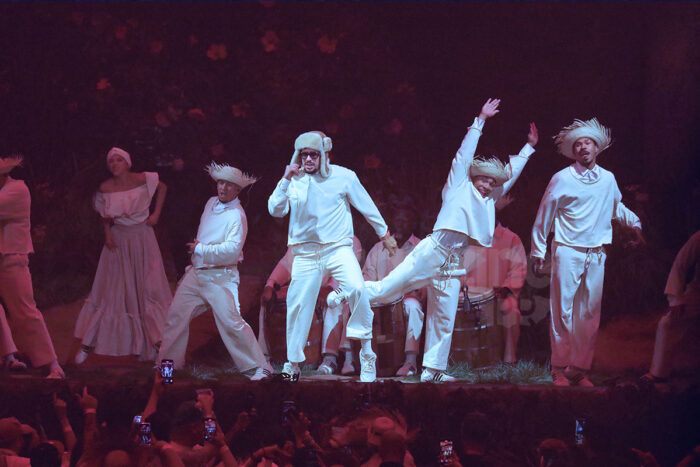Bad Bunny abrió con fuerza impetuosa interpretando “Qué tú te crees”, acompañado del percusionista Julito Gastó, seguido por “El Club”, “La Santa”, “Pitorro de coco” y el himno generacional “El Apagón”. Bajo la sombra del flamboyán, se unió al cuatrista José Eduardo Santana, para cantar versiones íntimas de “El Apagón”, “Weltita” y “Kloufiends”.