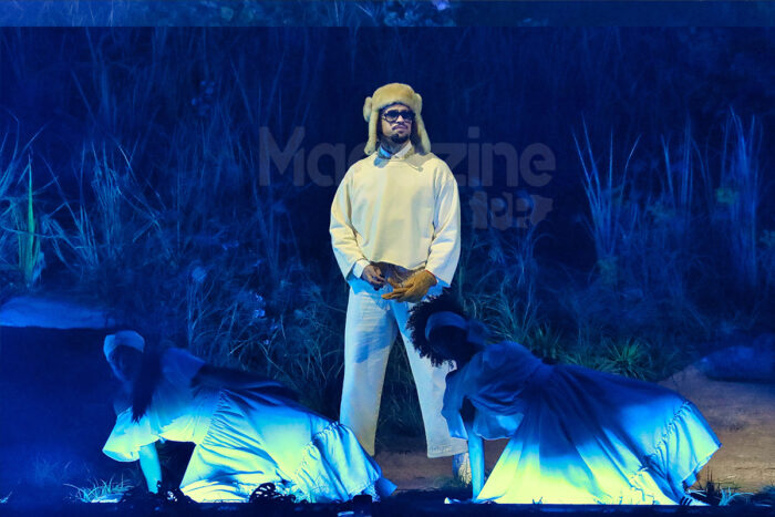 El escenario recreó una postal puertorriqueña auténtica: una montaña típica del campo, un flamboyán rojo en flor, la famosa silla blanca del video “Un Preview”, gallinas, gallos, vegetación y una casita de madera similar a la que aparece en “Debí tirar más fotos”. En el techo, del Choli, una constelación de estrellas iluminaba el firmamento, evocando las noches del campo. Todo gritaba “No me quiero ir de aquí”, una frase que se convirtió en emblema del espectáculo. La escenografía abrazó nuestra tierra boricua.