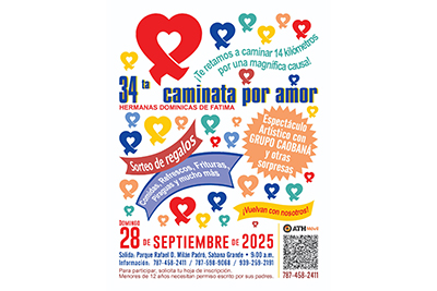 Las Hermanas Dominicas de Fátima les invita a la 34ta Caminata por Amor, que se llevará a cabo el domingo, 28 de septiembre de 2025.  Esta es una actividad que se celebra una vez al año con el fin de recaudar fondos. Este año pondremos prioridad en comenzar la restauración de nuestra Casa Madre ya que tras el terremoto 2020 aún no se ha contado con ayuda y no hemos podido hacer nada, ya tiene demasiadas filtraciones.  Guarda la historia de nuestra fundadora, la Sierva de Dios, M. Dominga Guzmán Florit, O.P. y nuestras misiones en Venezuela, Santo Domingo y otra que se abrirá pronto en Perú además de nuestras obras y proyectos en pro de las familias y otras necesidades de la Congregación.  Esta caminata tiene un propósito espiritual: los participantes caminan por sus intenciones y las de las personas que los auspicien.