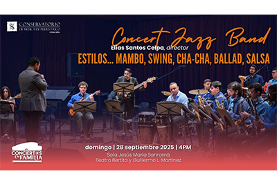 San Juan, P.R. – El Conservatorio de Música de Puerto Rico anuncia con entusiasmo la próxima edición de la serie de Conciertos en Familia, con la presentación del conjunto Concert Jazz Band, bajo la dirección del profesor Elías Santos Celpa. El evento titulado “Estilos… Mambo, Swing, Cha-Cha, Ballad, Salsa”, se llevará a cabo en la Sala Jesús María Sanromá del Teatro Bertita y Guillermo L. Martínez, este domingo, 28 de septiembre de 2025, a las 4:00 p.m.