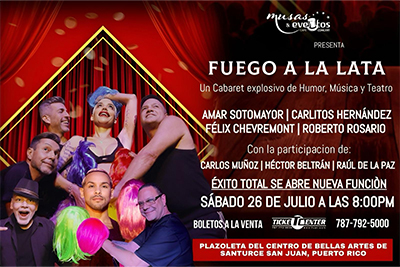 San Juan, Puerto Rico – Luego de tres funciones totalmente vendidas y un gran entusiasmo del público, el exitoso espectáculo “Fuego a la lata” regresa al escenario con su cuarta y última función de cierre de temporada, este sábado, 26 de julio a las 8:00pm, en Musas y Eventos del Centro de Bellas Artes de Santurce.
