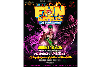 Esta convención será la segunda edición del evento “Fun Battles” y, en esta ocasión, el temático será de piratas en honor al anime número uno en el mundo, One Piece. Un evento para toda la familia: habrá juegos, retos físicos y mentales donde el público puede participar para ganar premios y demostrar sus habilidades o talentos en cada una de las categorías. Además, contarán con artistas invitados que le dan la voz a personajes de la serie de anime One Piece en español.