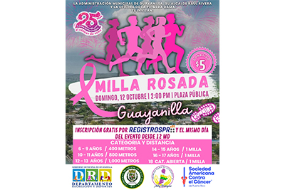 La Administración Municipal de Guayanilla, encabezada por el alcalde Raúl Rivera Rodríguez, junto a la Oficina de la Primera Dama y el Departamento de Recreación y Deportes, invita a toda la comunidad a participar en la tercera edición de la carrera Milla Rosada, que se llevará a cabo este domingo 12 de octubre de 2025 a las 2:00 p.m. en la Plaza Pública Luis Muñoz Marín de Guayanilla. Las inscripciones son gratuitas a través de REGISTROSPR y también estarán disponibles el mismo día del evento desde las 12:00 m.d. Aunque la participación es libre de costo, se sugiere un donativo de $5 para apoyar la causa.