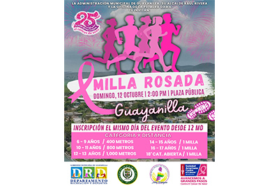La Administración Municipal de Guayanilla, su alcalde Raúl Rivera Rodríguez, la Oficina de la Primera Dama y el Departamento de Recreación y Deportes invitan a la comunidad a participar en la tercera edición de la carrera Milla Rosada, que se llevará a cabo el domingo 12 de octubre de 2025 a las 2:00 p.m. en la Plaza Pública Luis Muñoz Marín de Guayanilla. Las inscripciones comenzarán desde las 12:00 m.d., con un donativo de $5 por participante.