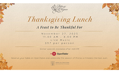 San Juan, Puerto Rico, – En un ambiente lleno de encanto histórico y vistas espectaculares sobre la ciudad antigua, el Hotel El Convento se complace en anunciar su celebración especial para el Día de Acción de Gracias con un Family Style Lunch. El evento – almuerzo se llevará a cabo el jueves, 27 de noviembre de 2025 de 11:00 a.m. a 4:00 p.m., en el Restaurante Patio del Níspero, uno de los espacios gastronómicos más encantadores del Viejo San Juan.