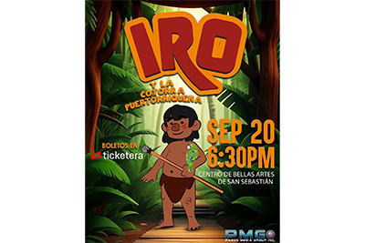 (Humacao, Puerto Rico.) Luego de una exitosa gira escolar que impactó a más de 4,000 estudiantes alrededor de la isla, la obra teatral infantil “IRO y la Cotorra Puertorriqueña” se presentará por primera vez para el público general el sábado, 20 de septiembre a las 6:00 p.m., en el Centro de Bellas Artes de San Sebastián, bajo la producción de Eric Jomar García Ortiz y Pazos Media Group Inc.