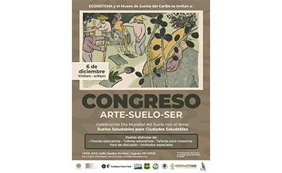 Caguas, Puerto Rico (19 de noviembre de 2025)– ECOSISTEMA y el Museo de Suelos del Caribe invitan a la comunidad en general a celebrar el Día Mundial del Suelo en el Congreso Arte-Suelo-Ser, que se llevará a cabo el 6 de diciembre en URBE APIE, ubicado en la Calle Gautier Benítez en el pueblo de Caguas. El evento tendrá actividades programadas de 10:00 AM a 4:00 PM.