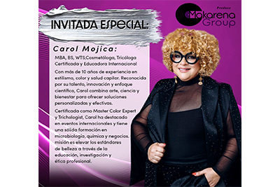 Contaremos con la presencia de nuestra educadora principal, Carol Mojica, una tricóloga certificada internacionalmente con más de 10 años de experiencia. Carol ha desarrollado técnicas revolucionarias para prevenir la caída del cabello y estimular su crecimiento de manera natural y efectiva. Su pasión por la ciencia y el bienestar la han convertido en una referente mundial, y ahora tendrá el honor de compartir sus secretos con profesionales comprometidos con la excelencia.