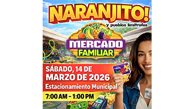 (Naranjito, PR. ) – Con el objetivo de promover el consumo de productos agrícolas locales y apoyar a los agricultores de la región, el Municipio de Naranjito celebrará un Mercado Familiar el próximo sábado, 14 de marzo de 2026, en el estacionamiento municipal, en horario de 7:00 a.m. a 1:00 p.m.