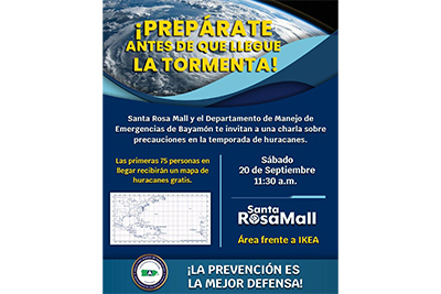 Bayamón, Puerto Rico  – Con el objetivo de educar y preparar a la comunidad ante la llegada de la temporada de huracanes, el Centro Comercial Santa Rosa Mall en colaboración con Manejo de Emergencias de Bayamón, llevará a cabo una charla informativa dirigida al público en general.