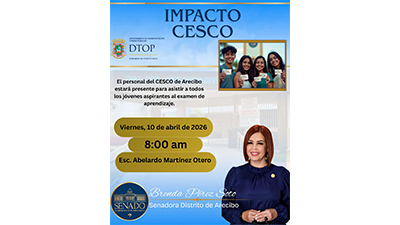 La propuesta, que se desarrolla en colaboración con las oficinas del Centro de Servicios al Conductor (CESCO), dará inicio este próximo viernes, 10 de abril de 2026, a las 8:00 de la mañana en la Escuela Abelardo Martínez Otero en Arecibo, donde los jóvenes tendrán la oportunidad de tomar el examen requerido para la licencia de aprendizaje y, de aprobarlo, avanzar en el proceso para convertirse en nuevos conductores responsables y respetando las leyes de tránsito.